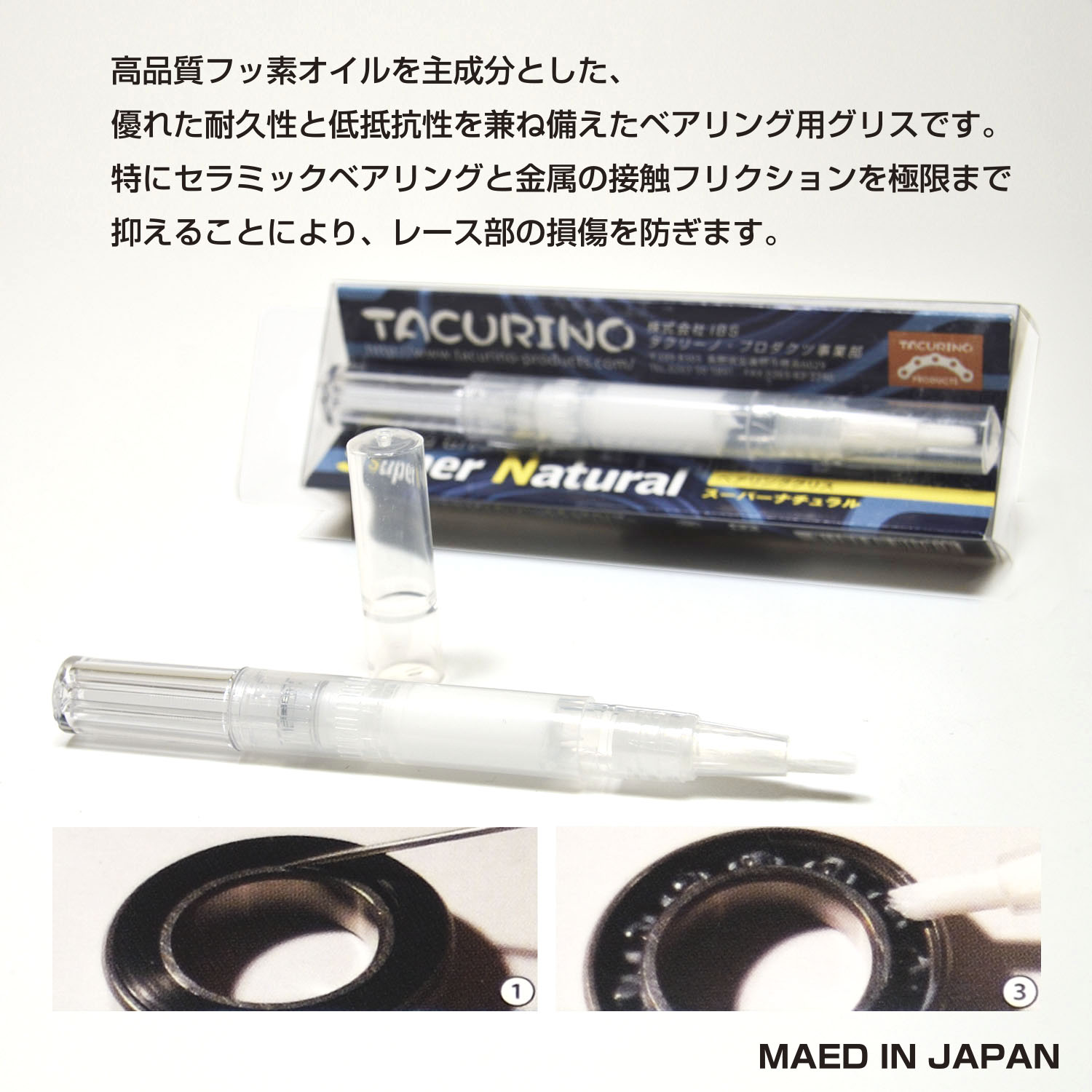高品質フッ素オイルを主成分とした、優れた耐久性と低抵抗性を兼ね備えたベアリング用グリスです。特にセラミックベアリングと金属の接触フリクションを極限まで抑えることにより、レース部の損傷を防ぎます。そして、鋼球ベアリングに本製品を使うとフリクション軽減によりセラミックベアリングのような使用感が得られます。