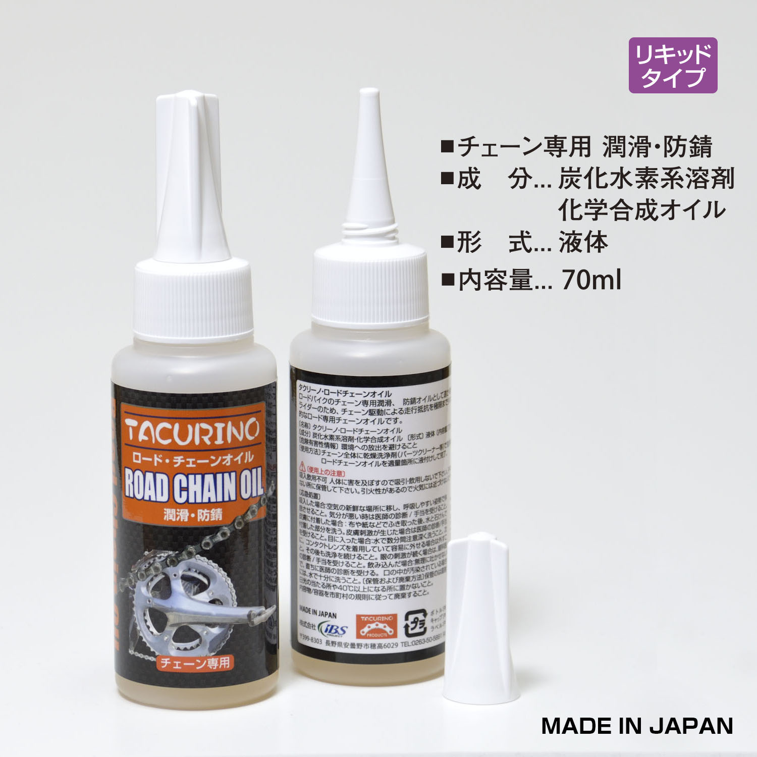また、高純度の化学合成オイルを100%近く配合しているのは市場に出回っているものではこの「タクリーノ・ロードチェーンオイル」だけであることも付け加えておきましょう。